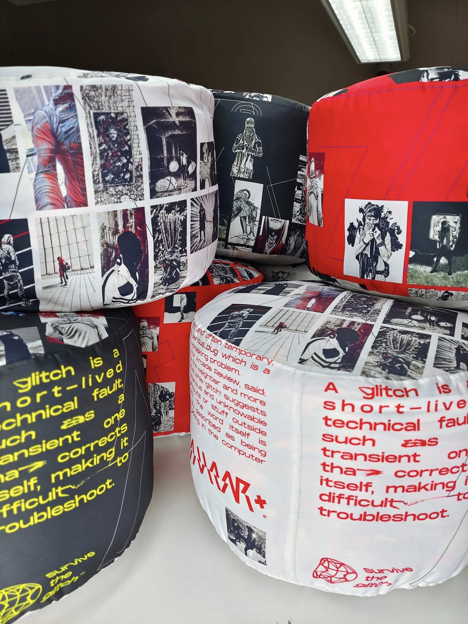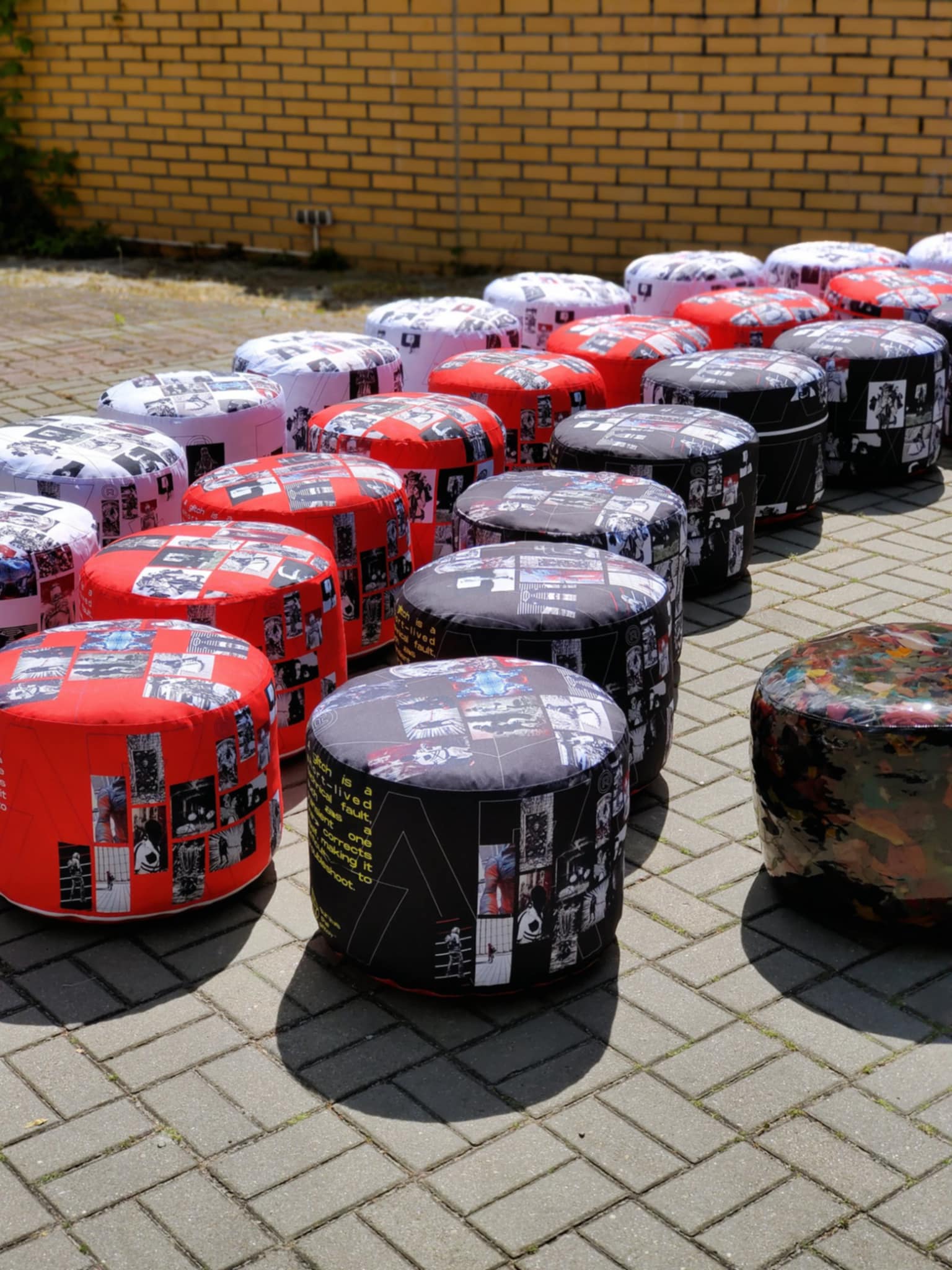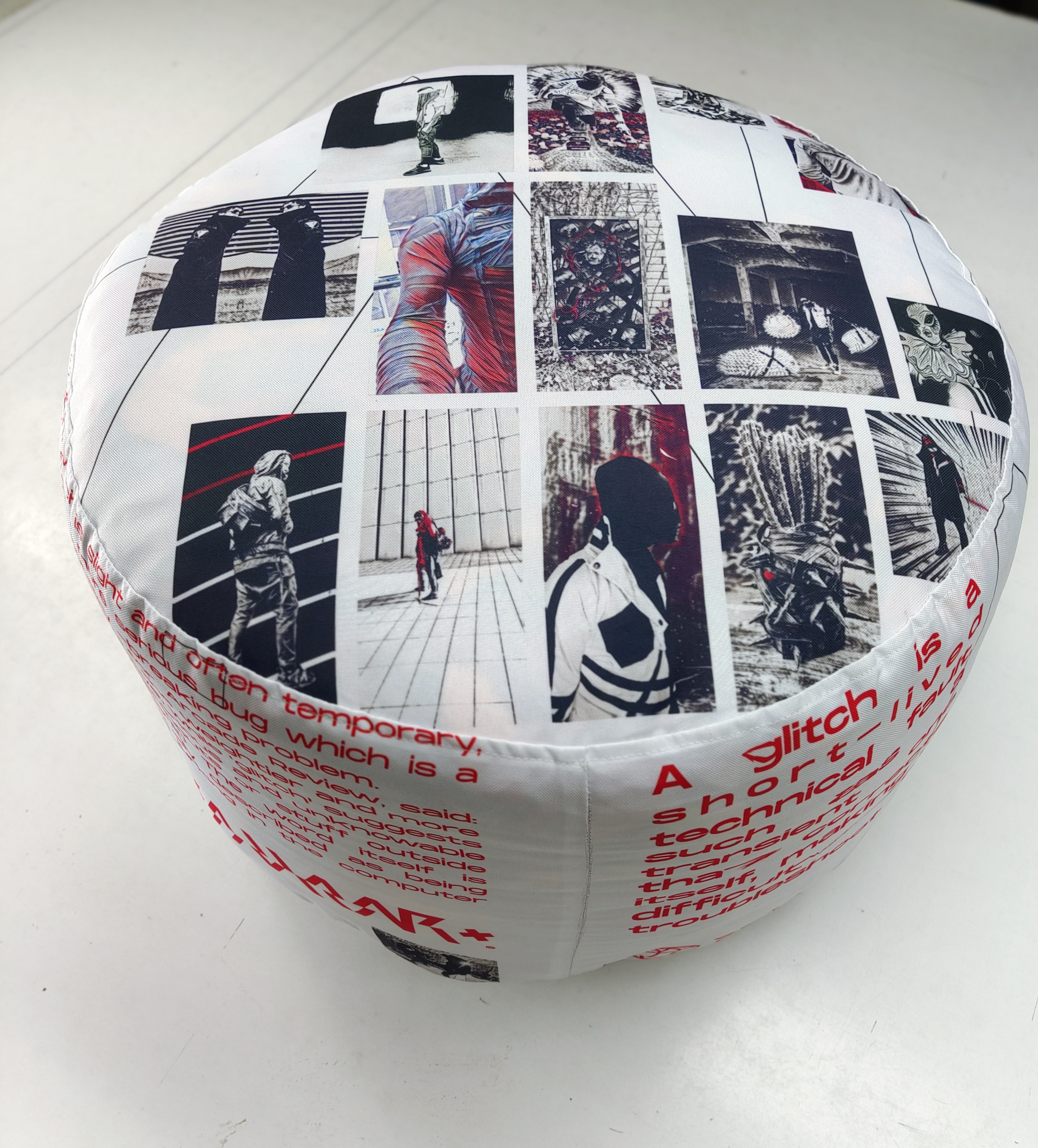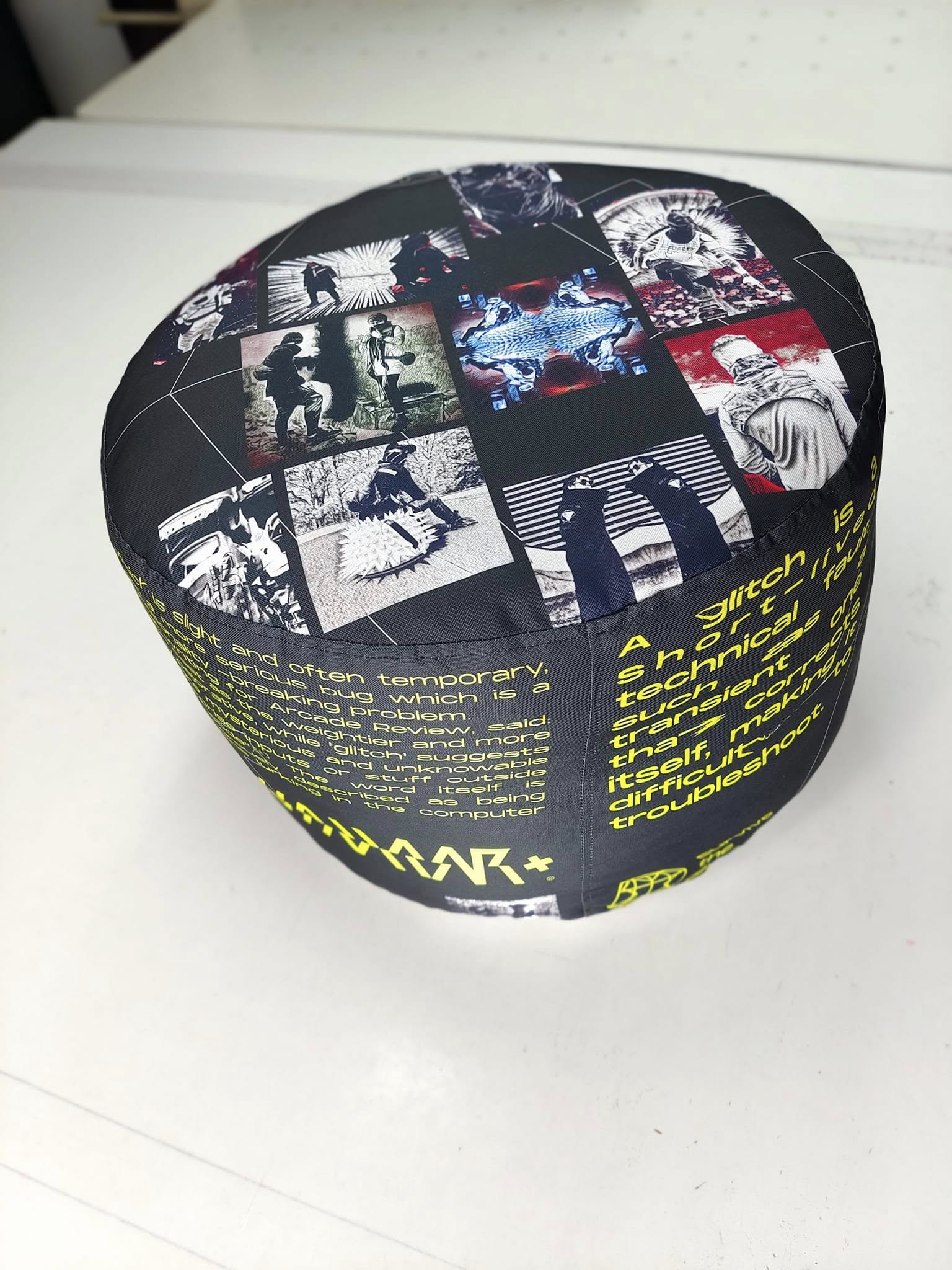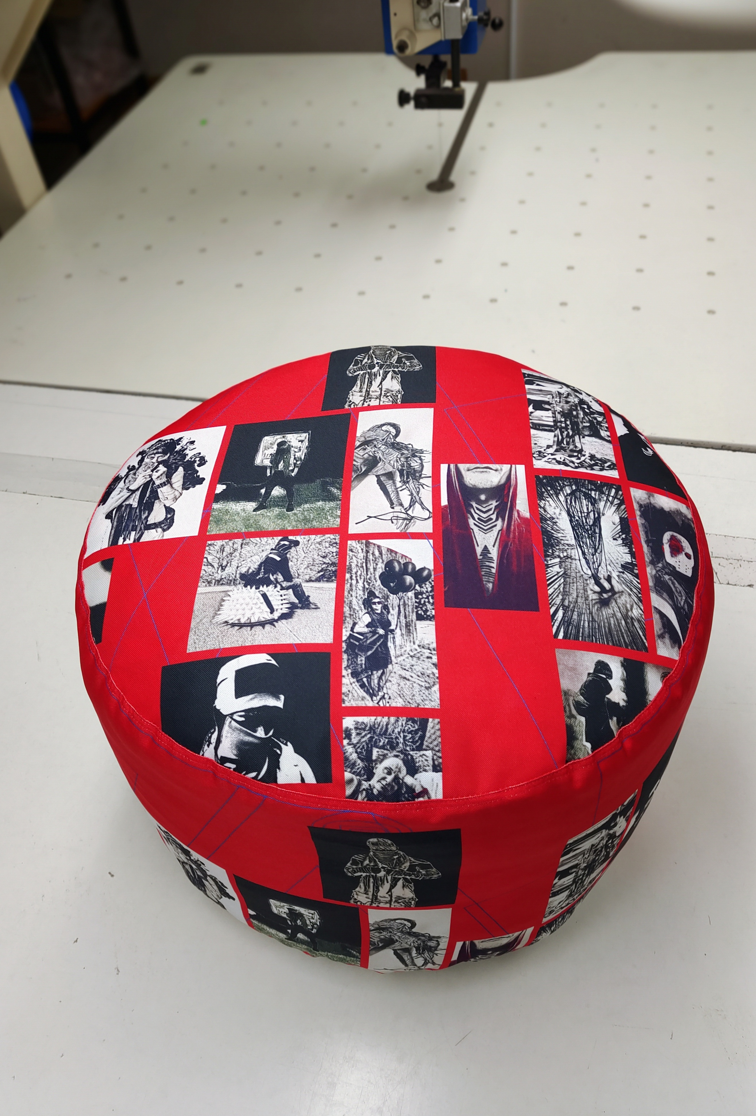 Pufa została wykonana z wodoodpornego materiału Oxford, na którym nadrukowano oryginalne prace marki AR+. Wypełnienie stanowią tekstylne odpady poprodukcyjne pochodzące z naszej szwalni, co czyni produkt bardziej ekologicznym.